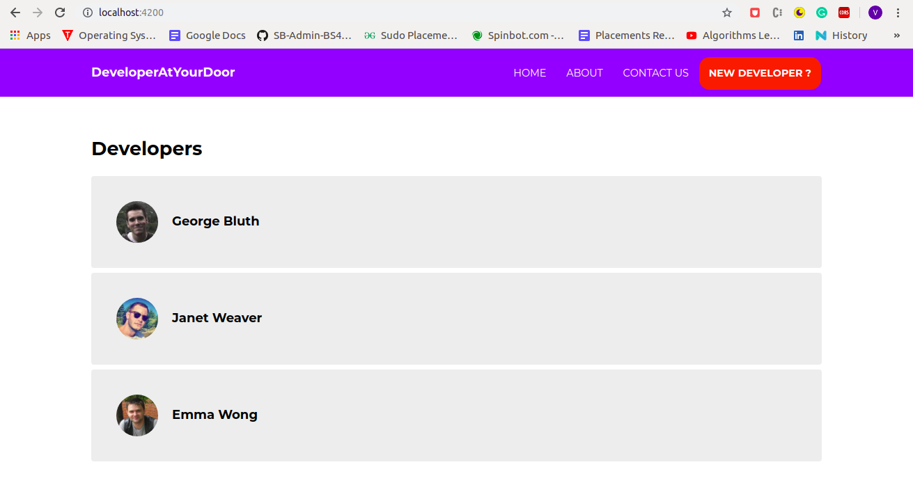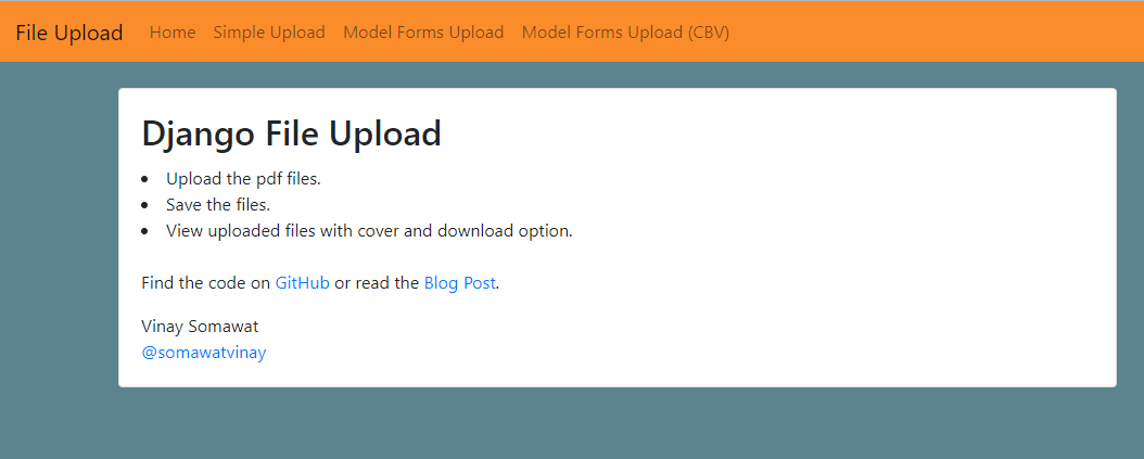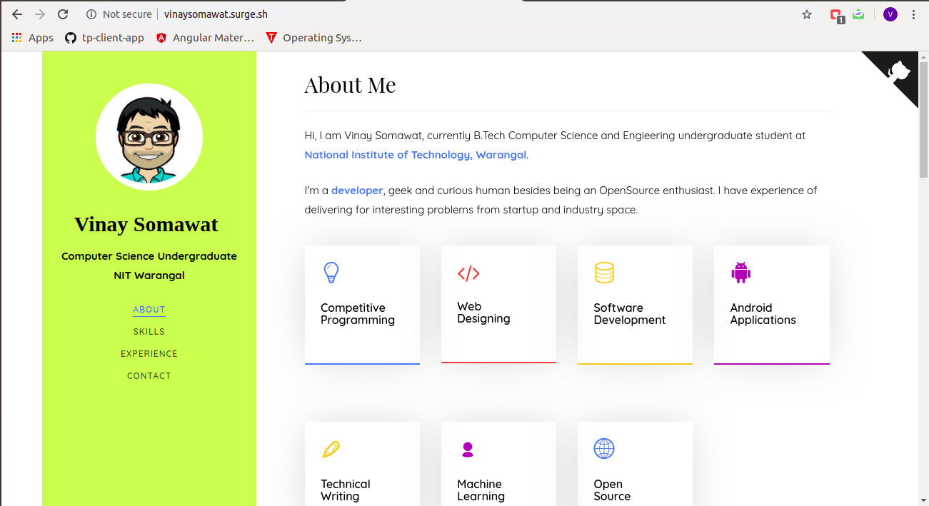 Travographer-portal It is an implementation to Setup Amazon S3 in a Django Project, how to use S3 to handle user uploaded files. Django AWS Bootstrap JavaScript Heroku Programming diaries Developed an blog application to provide content on Programming, web and android development to all the programmers and budding programmers across the internet. Django SQLite3 Bootstrap HTML5 CSS3 JavaScript Heroku DeveloperAtYourDoor Angular and spring based tool which shows a filtered list of developer profiles using back end APIs. Spring Angular 7 Bootstrap MongoDB HTML5 CSS3 JavaScript Heroku Web-Portfolio Web Portfolio to showcase acadmics, skills, projects and contact details in better manner. Bootstrap HTML5 CSS3 JavaScript Jquery Resume Builder Web based editor to build Resumes in a customizable templates. Bootstrap HTML5 CSS3 JavaScript Jquery Django File Handle Users can upload any img/pdf file and can view it with its cover picture with delete functionality. Django Python MySQL HTML5 CSS3 JavaScript